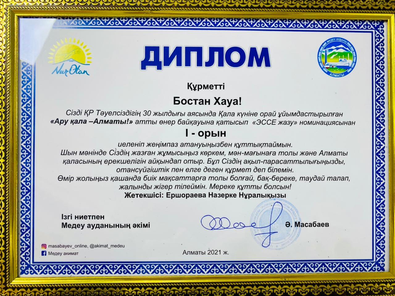 Алып шаһар Алматының туған күні қаламызда жыл сайын қыркүйек айының үшінші жексенбісінде аталып өтіледі. Аталған мерекеміз, қала күніне арналған Алматы қаласының оқушылары арасында ҚР Тәуелсіздігінің 30 жылдығына орай “ Ару қала - Алматы” атты байқауы болып өтті. Байқауда эссе жазу, бейнелеу, қол өнері номинациялары бойынша 8-13 жас аралығындағы жас өнерпаздар өз бақтарын сынады. Эссе жазу номинациясында лицейімізден 7А сынып оқушысы Бостан Хауа өзге қатысушылардан оза шауып, І дәрежелі орыннан көрінді. Жетекшісі: қазақ тілі мен әдебиеті пәні мұғалімі Ершораева Назерке Нұралықызы. Жас жеңімпазымызға марапатты Медеу ауданының әкімі Әсет Масабаев мырзаның өзі табыстады. Ару қала - Алматының мерейін үстем етіп, арнайы байқау ұйымдастырған Медеу аудандық әкімшілігі мен Медеу аудандық білім бөліміне алғысымызды айтамыз!