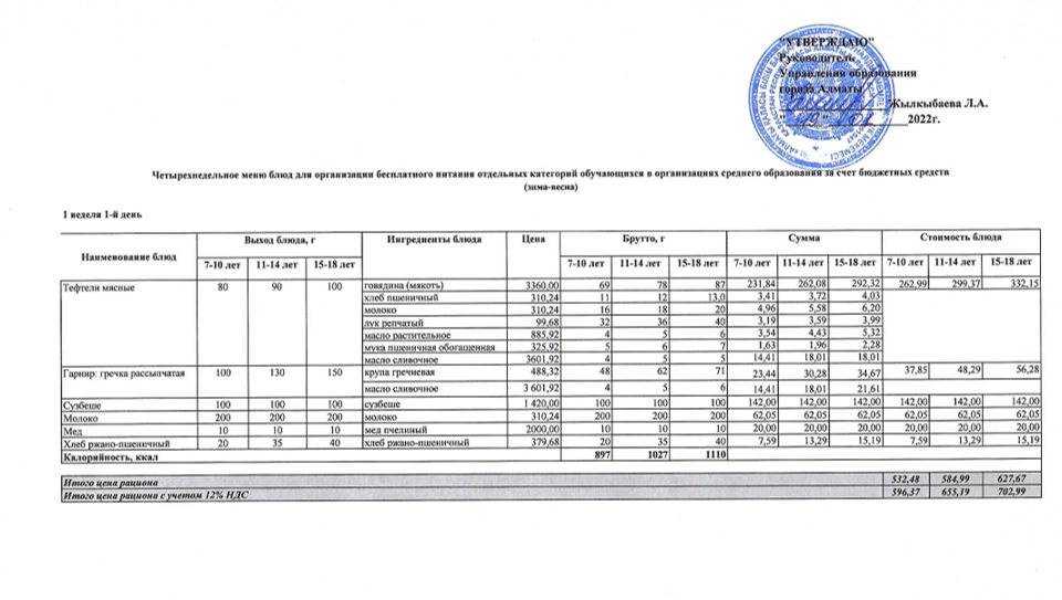 Школа-гимназия №161 г. Алматы » Ақпарат » Бюджет қаражаты есебінен орта білім беру ұйымдарында оқушылардың жекелеген санаттарын тегін тамақтандыруды ұйымдастыру үшін төрт апталық ас мәзірі (Қыс-көктем)