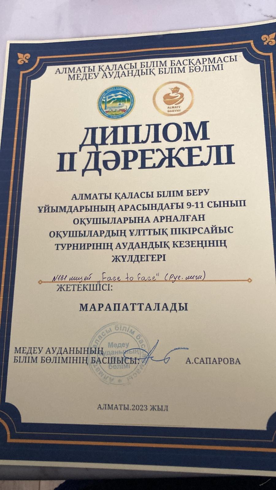 9-11-сынып оқушылары арасында “Ұлттық дебат турнирінде” “Face to face” фракциясы 9-сынып оқушысы Қанат Альтаир мен 10-сынып оқушысы Турарова Меруерт орыс лигасында жоғары дәрежелі өнер көрсетіп 2-орынмен қалалық кезеңге жолдама алды.