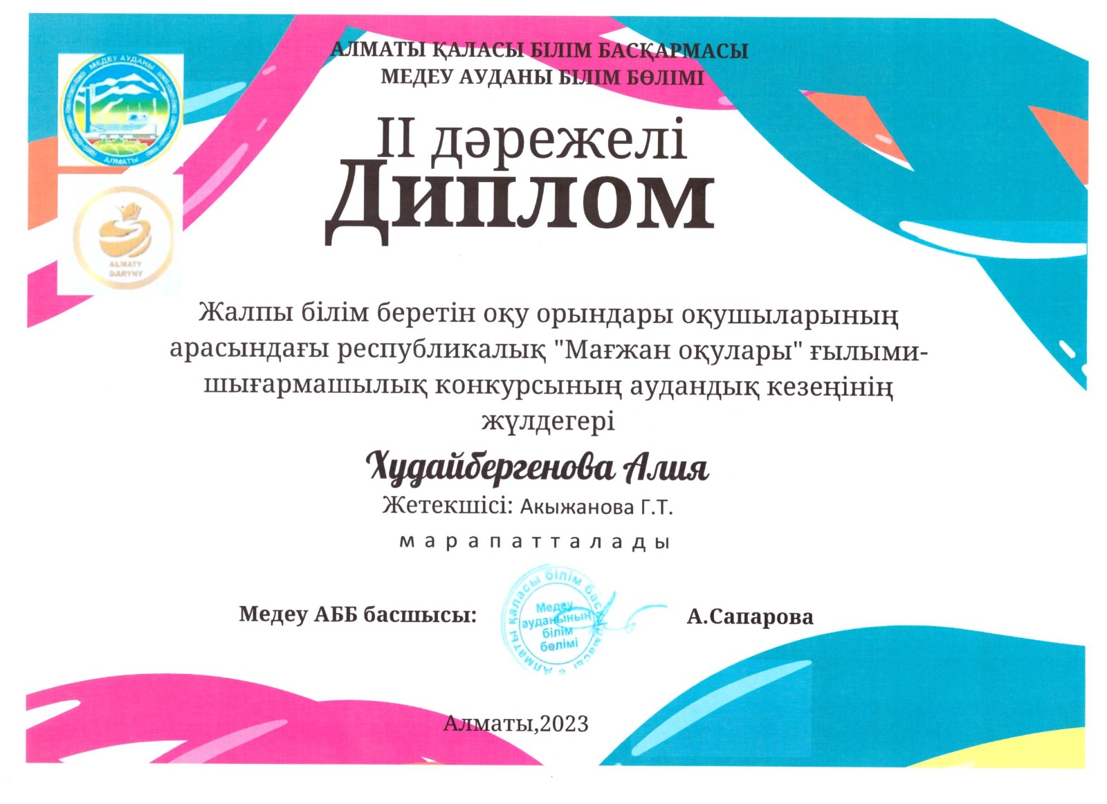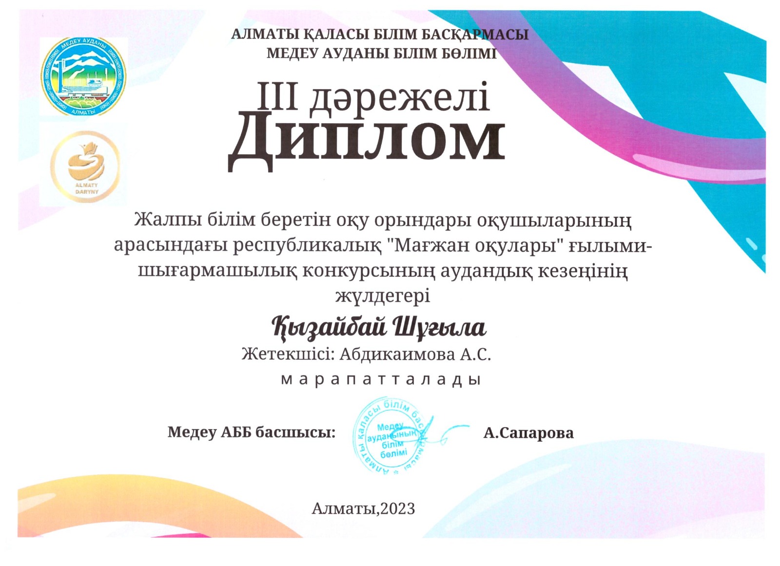 08.02.2023ж. күні 7-11 сынып оқушылары арасында өткен республикалық "Мағжан оқулары" ғылыми-шығармашылық байқауының Медеу аудандық кезеңінде 8 "б" сынып оқушысы Қызайбай Шұғыла "Ақында бір бала ғой айға ұмтылған..." атты номинациясынан - III орын, 9 "а" сынып оқушысы Бекжан Арай "Өлең - менің Шолпаным, Айым, Күнім" атты номинациясы бойынша - II орын, 9 "а" сынып оқушысы Худайбергенова Алия "Жасынан оқу оқып, өнер қуған..." атты номинациясы бойынша - II орын иеленді. Жеңістеріңіз құтты болсын!