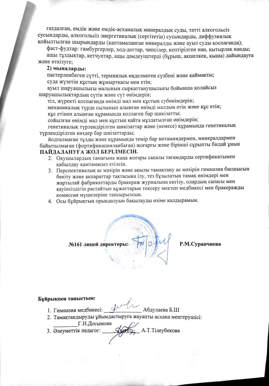 - Перспективалық ас мәзірін және ақылы тамақтану ас мәзірін гимназия басшысын бекіту және ақпараттар тақтасына ілу, тез бұзылатын тамақ өнімдері мен жартылай фабрикаттарды бракераж журналына енгізу, олардың сапасы мен қауіпсіздігін растайтын құжаттарын тексеру мектеп медбикесі мен бракеражды комиссия мүшелеріне тапсырылсын.
