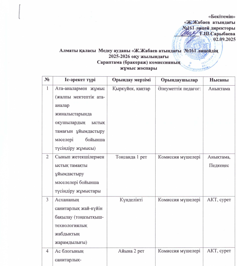 02 сентябрь 2025 0 1 2 3 4 5 Ж.Жабаев атындағы №161 лицейдің 2025-2026 оқу жылындағы Сараптама (бракераж) комиссияның жұмыс жоспары Осы беттің QR-коды:QR-код этой страницы: